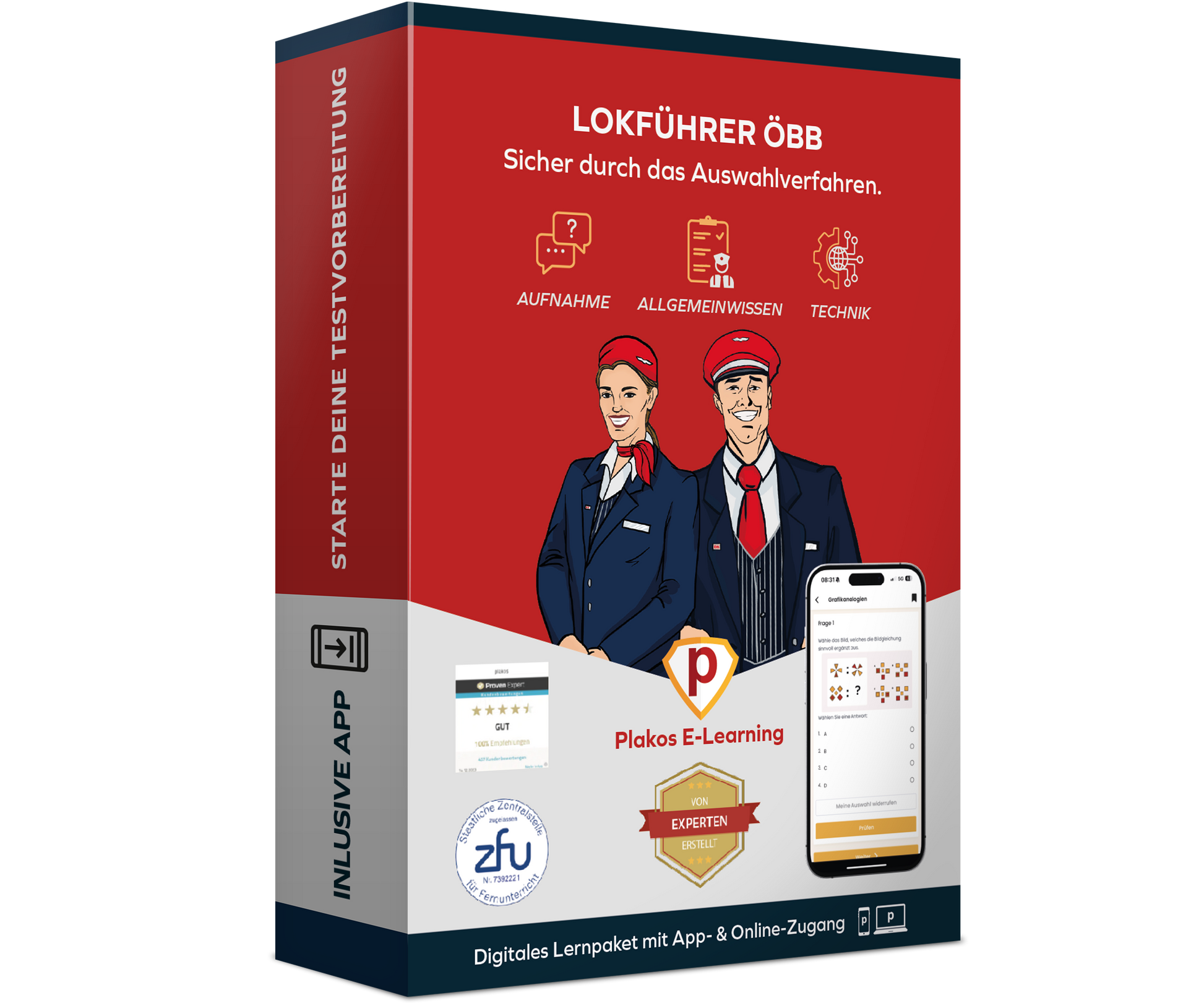 Online Prüfungsvorbereitung mit zahlreichen interaktiven Übungsaufgaben und Lerneinheiten – die perfekte Vorbereitung auf Lokführer ÖBB Einstellungstest. Starte selbstbewusst in die Prüfung! Jetzt inklusive Plakos KI-Trainer!